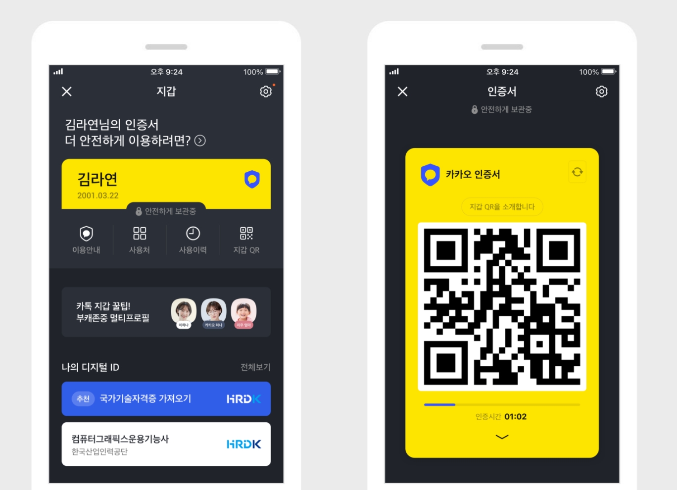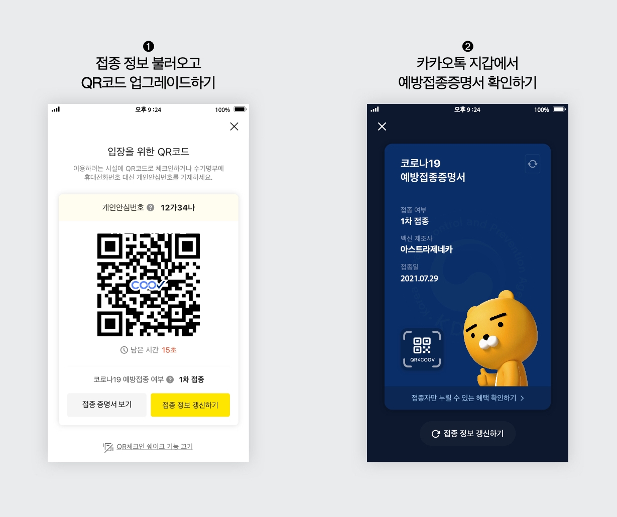 접종을 완료한 이용자는 카카오톡으로 코로나19 백신 접종 증명을 할 수 있습니다. 전자출입명부(Ki-Pass, Korea Internet - Pass) 카카오톡 QR체크인 화면에서 '접종 정보 불러오기'를 누르고 동의 절차를 거치면 QR코드에 백신 접종 정보도 함께 담긴입니다. 코로나19 예방접종증명서도 발급되어 카카오톡 지갑에서 확인할 수 있습니다.